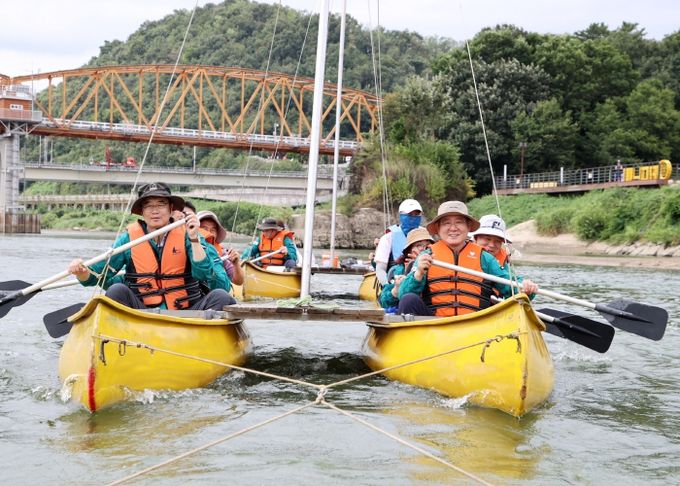 '부자뱃길투어'는 거부 탄생을 예고한 솥바위와 소원을 이룬다는 탑바위, 삼성그룹 창업주 이병철 회장 생가 등 부자 기운 넘치는 관광지 5곳을 문화해설사와 함께 무동력 배에 탑승해 8.5㎞ 구간을 1시간 동안 둘러보는 코스다.