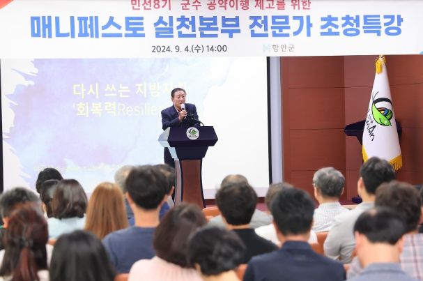 [경남도민뉴스=이상민 기자] 함안군은 4일 군청 3층 대회의실에서 조근제 함안군수를 비롯한 공약담당 등 90여 명을 대상으로 민선8기 군수 공약사업 이행률 향상을 위한 매니페스토 전문가 초청 특강을 개최했다.
