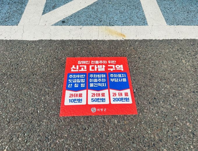 [경남도민뉴스=이상민 기자] 의령군은 장애인을 배려하는 주차 문화 정착을 위해 장애인전용주차구역 위반 신고 다발 구역에 장애인전용주차구역 식별이 쉽도록 바닥 스티커를 부착했다고 5일 밝혔다.
