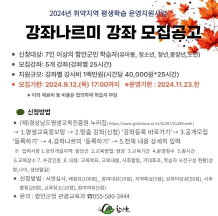 [경남도민뉴스=이상민 기자] 함안군은 군민의 평생학습 참여 기회를 확대하고, 언제, 어디서나 평생학습을 즐길 수 있도록 오는 12일까지 ‘강좌나르미’ 참여자를 모집한다고 밝혔다.