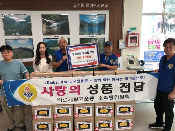 [경남도민뉴스=최미정 기자] 양산시 소주동 바르게살기운동협의회(회장 홍현곤)는 5일 추석 명절을 앞두고 도움이 필요한 이웃을 위해 소주동행정복지센터에 라면 60박스를 전달했다.
