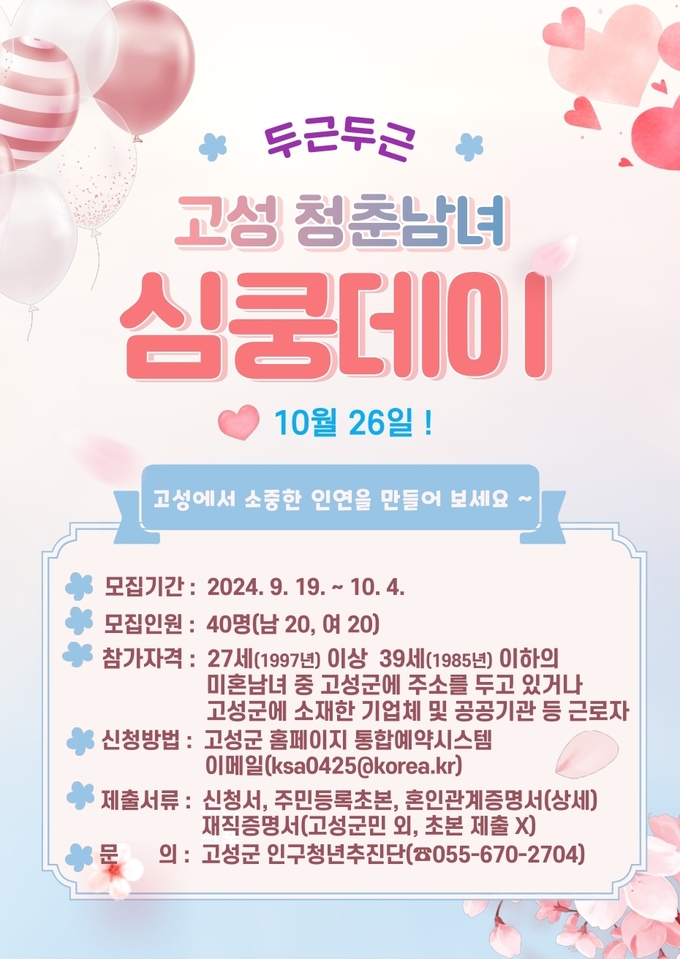 [경남도민뉴스=이형섭 기자] 고성군은 오는 10월 26일, 고성군 미혼남녀를 대상으로'두근두근, 고성 청춘남녀 ‘심쿵데이’'를 개최한다.