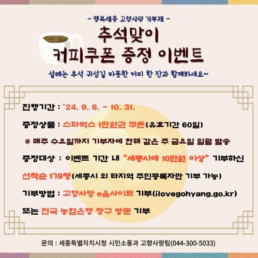 [경남도민뉴스=도문호 기자] 세종특별자치시가 6일부터 내달 31일까지 세종 고향사랑기부제로 10만 원 이상 기부한 국민을 대상으로 추석맞이 커피쿠폰 증정 이벤트를 진행한다.