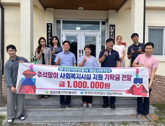 [경남도민뉴스=이형섭 기자] 하동군은 지난 5일 한국전기안전공사 경남서부지사(지사장 정용욱)에서 추석을 맞아 하동지역자활센터(센터장 손호연)에 100만 원의 지원금을 전달했다고 밝혔다.