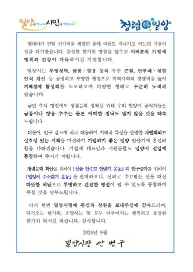 [경남도민뉴스=나희준 기자] 밀양시는 민족 대명절 추석을 앞두고 6일 지역 내 기업체와 용역업체 427곳을 대상으로 청렴 서한문을 발송했다고 밝혔다.