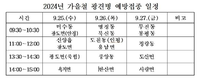 접종일정은 통영시 홈페이지에서도 확인할 수 있으며, 우천 시에는 조정될 수 있다. 자세한 사항은 통영시 농축산과로 문의하면 된다.