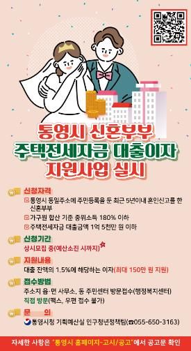 [경남도민뉴스=김부경 기자] 통영시는 관내 신혼부부의 주거비 부담을 완화하고 결혼·출산 친화환경을 조성하기 위해 ‘신혼부부 주택 전세자금 대출이자 지원 사업’의 대상자를 상시 모집 중이다.