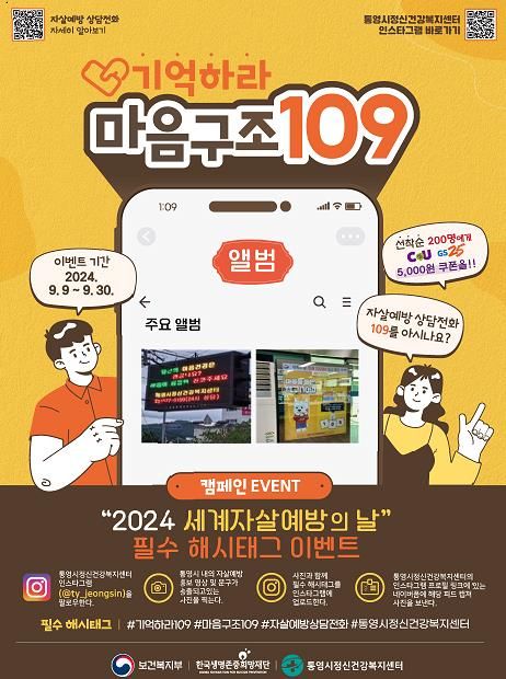 통영시정신건강복지센터는 시민들의 마음건강을 위한 교육 및 홍보활동을 추진하고 있으며, 지난 9일부터 30일까지 “기억하라 마음구조109” 필수 해시태그 온라인 이벤트 진행을 비롯해 지역사회와 연계한 홍보캠페인 등 지속적인 홍보활동을 추진해 나갈 예정이다.