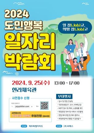 [경남도민뉴스=경남도민뉴스 기자] 제주특별자치도는 오는 25일 오후 1시부터 5시까지 제주 한라체육관에서 ‘일 잡(Job)고, 희망 잡(Job)고’라는 슬로건 아래'2024 도민행복 일자리박람회'를 개최한다.