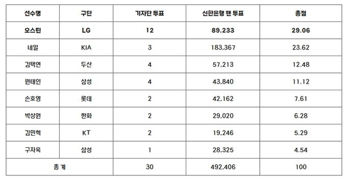 오스틴은 기자단 투표 30표 중 12표(40.0%), 팬 투표에서 492,406표 중 89,233표(18.1%)를 받아 총점 29.06점을 획득, 기자단 3표, 팬 투표 183,367표, 총점 23.62점으로 2위를 차지한 KIA 네일을 제치고 최종 1위에 올랐다.