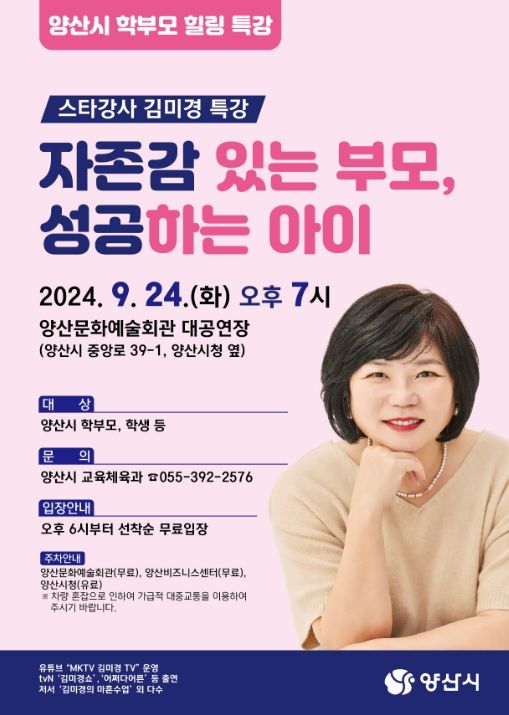 [경남도민뉴스=최미정 기자] 양산시는 학생과 학부모들이 입시에 대한 스트레스를 해소하고 새로운 동기와 활력을 가질 수 있도록 학부모 힐링 특강을 오는 24일 오후 7시 양산문화예술회관 대공연장에서 개최한다.
