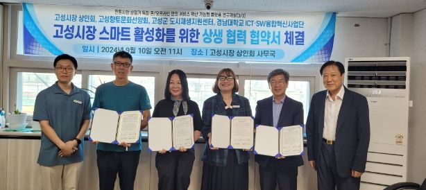 이날 협약식은 고성시장 상인회를 비롯하여 경남대학교 산학협력단 산하 ICT·SW 융합혁신사업단(교수 정규식), 고성향토문화선양회(회장 박서영), 고성군 도시재생지원센터(센터장 황인주)가 참여했다.