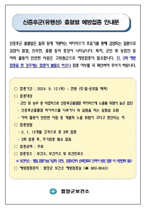 기타 신증후군출혈열 예방접종과 관련된 궁금한 사항은 함양군보건소 예방접종실로 문의하면 된다.