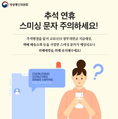 [경남도민뉴스=경남도민뉴스 기자] 추석 명절을 앞두고 코로나19 정부지원금 지급대상, 택배 배송조회 등을 사칭한 사이버 사기가 예상됩니다. 피해 예방을 위해 다음과 같은 사항을 유의해주세요!