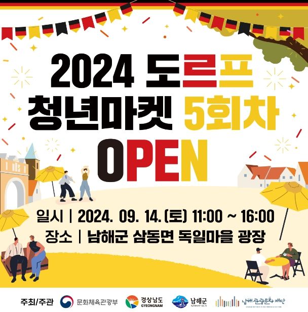 [경남도민뉴스=김부경 기자] 남해군 관광문화재단은 오는 9월 14일 독일마을 광장에서 ‘2024년 5회차 도르프 청년마켓’을 연다고 밝혔다.