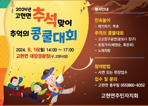 [경남도민뉴스=김부경 기자] 고현면 주민자치회(회장 고원오)는 추석을 맞아 향우들과 함께하는 추억의 콩쿨대회를 9월 16일 14시부터 17시까지 고현면 대장경광장(구, 탑동 시장)에서 개최한다고 밝혔다.