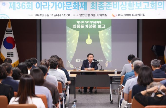 [경남도민뉴스=이상민 기자] 아라가야의 역사문화를 널리 알리기 위한 ‘제36회 아라가야문화제’가 오는 10월 11일부터 13일까지 3일간 함안박물관·말이산고분군 일원에서 열리는 가운데 축제의 성공적인 개최를 위한 ‘제36회 아라가야문화제 최종준비상황 보고회’가 지난 11일 오후 2시 군청 3층 회의실에서 개최됐다.