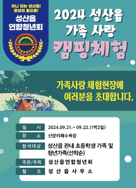 [경남도민뉴스=경남도민뉴스 기자] 서귀포시 성산읍연합청년회는 오는 9월 21일부터 22일까지 이틀간 신양리 해수욕장에서 “가족사랑 캠핑 체험” 행사를 개최한다고 밝혔다.
