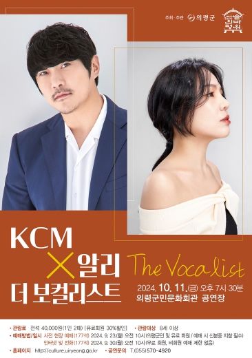 [경남도민뉴스=이상민 기자] 의령군은 자체 기획공연인 ‘KCM X 알리 더 보컬리스트’를 오는 10월 12일 오후 7시 30분, 의령군민문화회관 공연장에서 선보인다고 밝혔다.