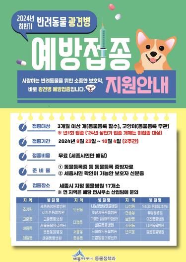 협력 동물병원 목록은 세종시청 누리집 공지사항에서 확인할 수 있고 면 지역 주민의 경우 해당 지역 행정복지센터(면사무소) 산업 담당을 통해 신청하면 출장 접종도 가능하다.