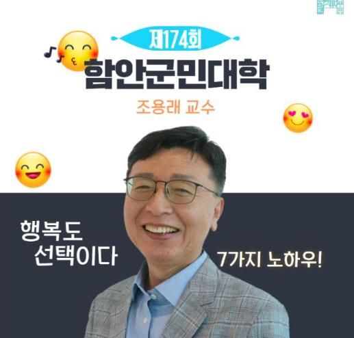 [경남도민뉴스=이상민 기자] 함안군은 오는 20일 오후 2시 30분 함안군청 3층 대회의실에서 조용래 한림대학교 심리학과 교수를 초청해 가을맞이 제174회 함안군민대학 강연을 개최한다.