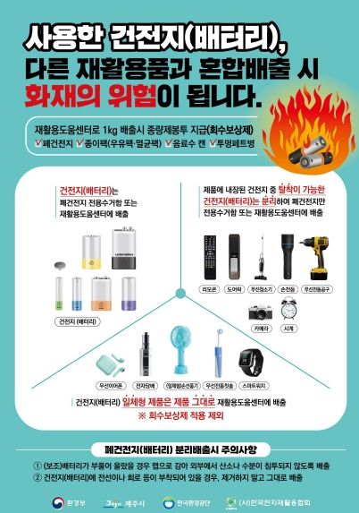 실제 다른 지역에서는 폐건전지 혼합배출로 수거차량에 화재가 발생하거나, 선별장에서 중장비(포크레인)가 리튬전지가 내장된 소형 가전을 밟아 폭발 및 화재 사고로 이어진 사례가 있다.
