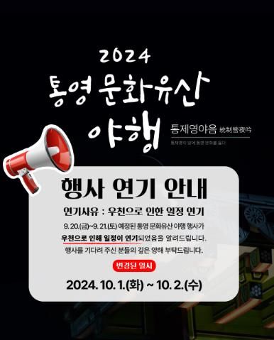 [경남도민뉴스=김부경 기자] (재)통영한산대첩문화재단에서는 ‘2024 통영 문화유산 야행’ 우천으로 인해 행사일정을 연기한다고 19일 밝혔다.