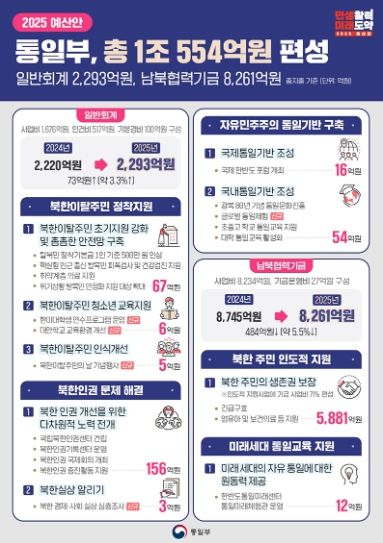 [경남도민뉴스=경남도민뉴스 기자] 통일부의 2025년 예산안 규모는 총 1조 554억 원으로 편성됐습니다.
