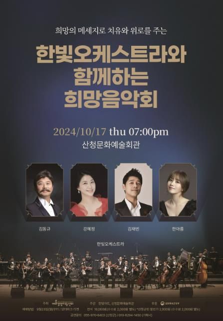 [경남도민뉴스=장광동 기자] 산청군은 오는 10월 17일 문화예술회관 대공연장에서 2024년 지역맞춤형 중소규모 콘텐츠 유통사업 선정작 ‘한빛오케스트라와 함께하는 희망음악회’를 마련했다고 20일 밝혔다.
