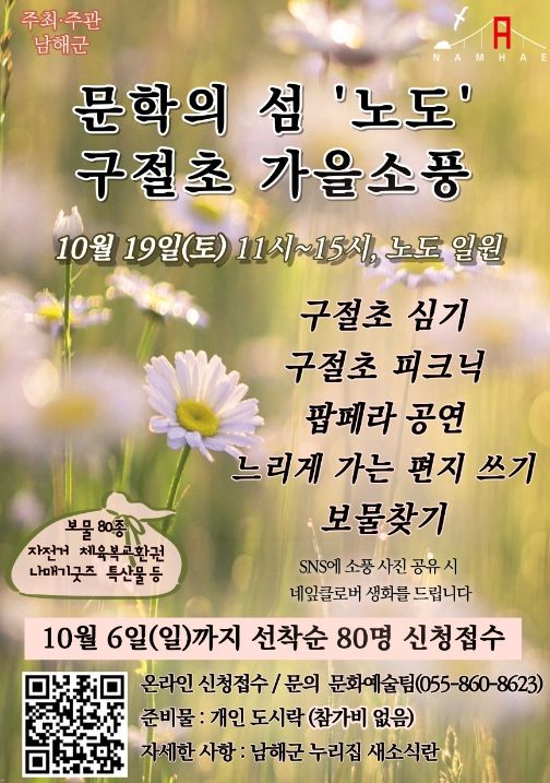 [경남도민뉴스=김부경 기자] 남해군은 한글 소설 '구운몽'과 '사씨남정기'의 저자 서포 김만중 선생의 유배지인 ‘문학의 섬, 노도‘를 널리 알리고, 참가자들에게 특별한 추억을 선물하고자 오는 10월 19일 노도 일원에서 구절초 가을소풍을 개최한다고 밝혔다.