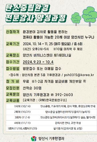 양산시는 오는 9월 23일부터 2주간 탄소중립환경전문가 양성과정에 참여할 교육생 30명을 선착순으로 모집할 계획으로 컴퓨터 활용이 가능한 20세 이상의 양산시민은 누구나 참여 가능하다.