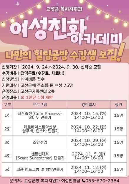 [경남도민뉴스=이형섭 기자] 고성군은 여성친화도시 활성화 지원 사업으로 10월 15일부터 11월 12일까지 매주 화요일 오후 2시 고성군가족센터 2층에서 고성군에 거주하는 여성을 대상으로 ‘여성친화 아카데미 나만의 힐링 공방’을 운영한다.