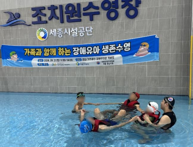 [경남도민뉴스=도문호 기자] 세종특별자치시육아종합지원센터는 9월 21일 조치원복합커뮤니티센터 내 수영장에서 관내 거주 중인 장애유아 6, 7세(2019-2018년생)와 학부모를 대상으로‘가족과 함께하는 장애유아 생존수영’프로그램을 실시했다고 밝혔다.