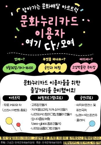 우리군은 고성박물관 휴관일인 9월 30일(월)에 고성박물관 주차장에서 타악공연 및 융합국악(퓨전국악), 색소폰 연주, 클래식 등 풍성하고 수준 높은 다양한 공연과 고추장 만들기, 자개 공예, 나만의 공룡머그컵 만들기 등 문화누리 예술시장(아트마켓)을 함께 진행한다.