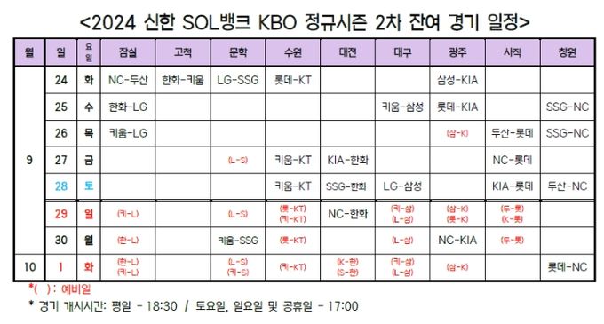 [경남도민뉴스=경남도민뉴스 기자] KBO는 24일(화) 2024 신한 SOL뱅크 KBO 정규시즌 2차 잔여 경기 일정을 확정했다.