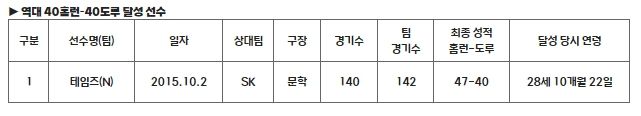 KBO 리그에서 40홈런 – 40도루를 기록한 선수는 2015시즌 전 NC 테임즈가 유일하다. 김도영이 홈런 2개를 추가할 경우 국내 선수로는 첫 번째로 40-40 클럽에 이름을 올릴 예정이다.