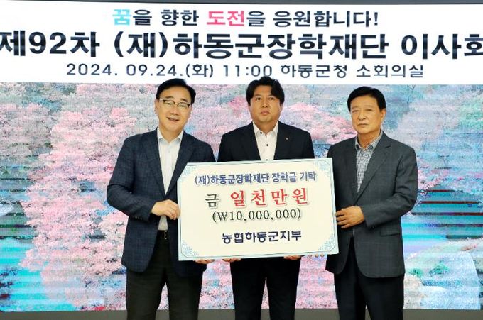 [경남도민뉴스=이형섭 기자] (재)하동군장학재단은 지난 24일 NH농협은행 하동군지부가 하동군청 소회의실에서 인재 육성 장학기금 1천만 원을 전달했다고 밝혔다.