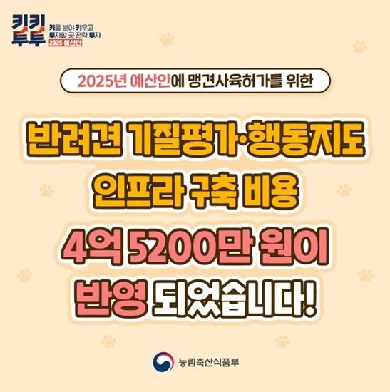 [경남도민뉴스=경남도민뉴스 기자] 2025년 농림축산식품부 예산안에 맹견사육허가를 위한 반려견 기질평가·행동지도 인프라 구축 비용 4억5200만원을 반영했습니다.