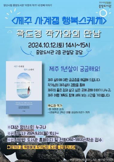 [경남도민뉴스=최미정 기자] 양산시립 중앙도서관은 양산지역의 작가와 책 이야기를 나눠보는 ‘이웃의 작가’ 네 번째 이야기로 10월 12일 토요일 오후 2시, 중앙도서관 관설당 강당에서 '제주 사계절 행복 스케치' 곽도경 지역 작가와의 만남을 운영한다.
