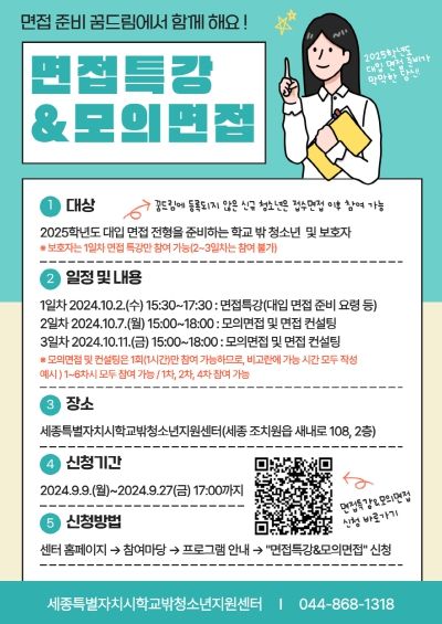 [경남도민뉴스=도문호 기자] 세종특별자치시학교밖청소년지원센터은 학교 밖 청소년의 대학 진학에 도움을 주고자 세종특별자치시교육청진로교육원의 대입지원단과 연계하여 ‘면접특강 및 모의면접’을 실시한다.