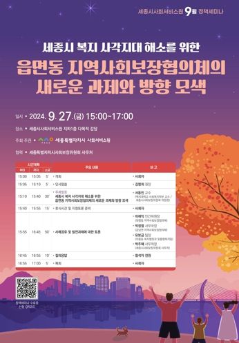 [경남도민뉴스=도문호 기자] 세종시사회서비스원은 오는 27일 오후 3시 보람복지센터 지하 1층 다목적 강당에서‘세종시 복지 사각지대 해소를 위한 읍면동 지역사회보장협의체의 새로운 과제와 방향 모색’을 주제로 정책세미나를 개최한다.