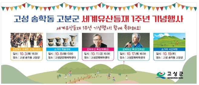 [경남도민뉴스=이형섭 기자] 고성군은 고성 송학동 고분군의 유네스코 세계유산 등재 1주년을 맞이하여 10월 중 다양한 문화·학술 행사를 개최한다고 밝혔다.