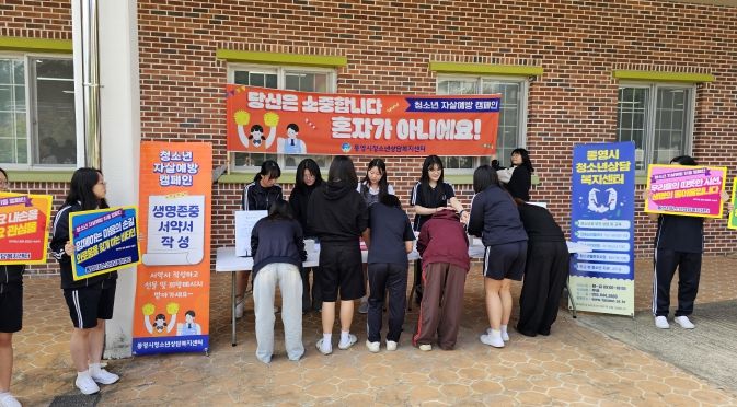 통영시에서는 최근 자살률이 증가하고 청소년 정신건강에 대한 사회적 관심과 대책 마련이 시급해지고 있는 상황에서 이러한 문제에 대응하기 위해 통영시청소년상담복지센터 주관으로 청소년이 자신과 타인을 돌보는 생명 존중 분위기 확산을 위해 청소년 자살 예방 캠페인을 개최했다.
