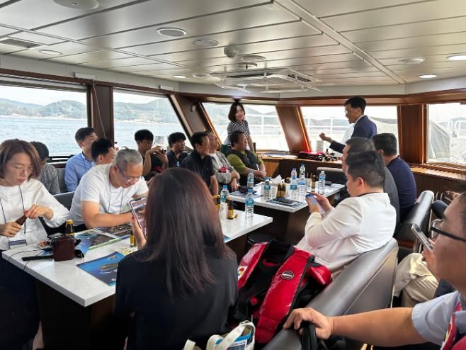 현장투어 첫날 오전에 고성을 방문한 참가자들은 자란도 주변을 선박으로 이동면서 투자환경에 대한 설명을 듣고 질의응답 시간을 가졌다.