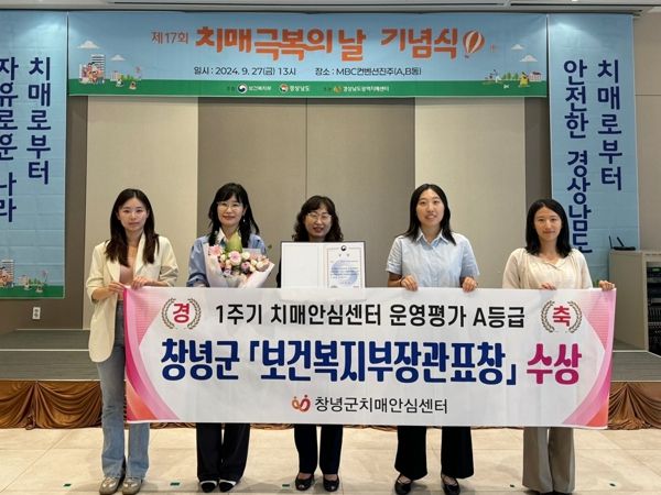 [경남도민뉴스=김병현 기자] 창녕군은 지난 27일 보건복지부 치매안심센터 1주기 운영 평가에서 최고등급인‘A등급’을 받아 보건복지부 장관 표창을 수상했다고 밝혔다.