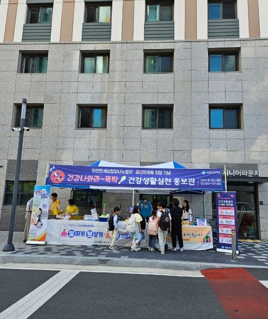 이날 행사는 오후 3시부터 5시까지 아파트 입구에서 △공동주택 금연 구역 지정 및 과태료부과에 대한 설명 △이동 금연 클리닉 운영 △올바른 걷기 시연 △건강한 식단에 대한 홍보 △금연 구역 지정 기념 인증샷 이벤트를 통한 SNS를 통한 홍보 등 성별과 세대를 아우르는 다양한 홍보가 이어졌다.