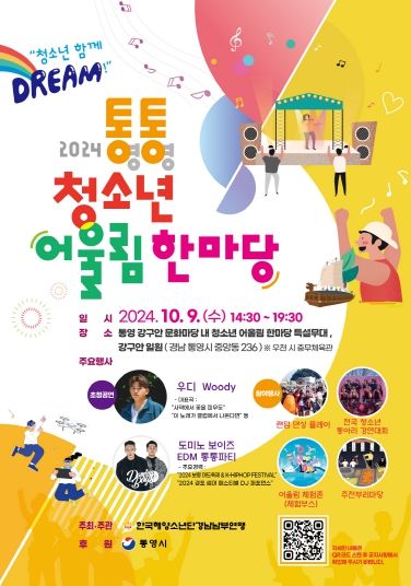 [경남도민뉴스=김부경 기자] 통영시는 오는 10월 9일 오후 2시 30분부터 강구안 문화마당 및 해상공연장에서 청소년 및 가족, 시민 등을 대상으로『2024 통영통영 청소년어울림한마당』행사를 개최한다.