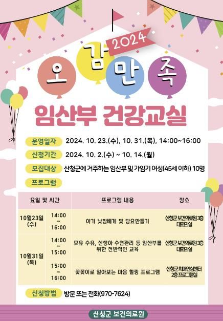 [경남도민뉴스=장광동 기자] 산청군은 ‘오감만족 임산부 건강교실’을 운영한다고 2일 밝혔다.