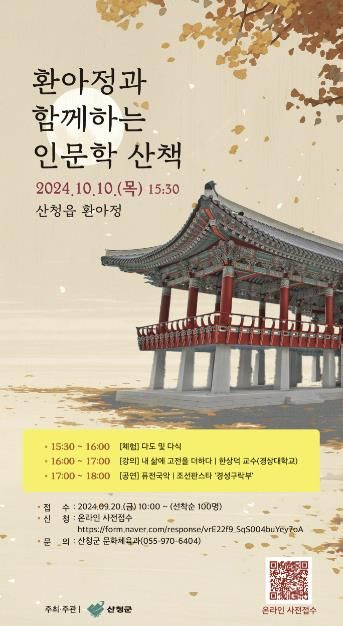 [경남도민뉴스=장광동 기자] 산청군은 주민참여 예산 일환으로 오는 10일 산청읍 환아정에서 ‘환아정과 함께하는 인문학 산책’을 마련했다고 2일 밝혔다.