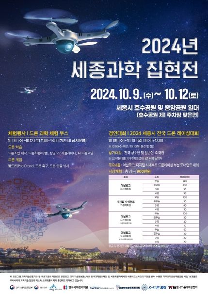 세종특별자치시가 주최하고 (재)세종테크노파크가 주관하며 케이(K)-드론협회·한국드론레이싱협회가 참여하는 ‘세종과학집현전’은 오는 9∼12일까지 열리는 ‘2024 세종축제’와 연계해 진행된다.